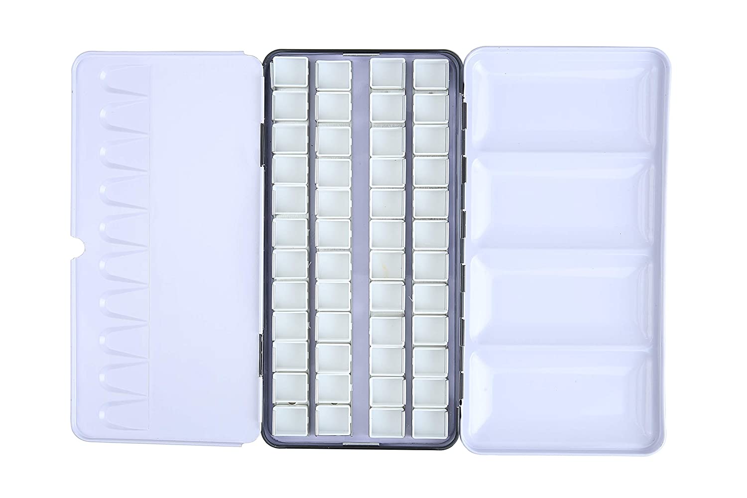 • Includes 48 empty half pans which are detachable Each pan can hold upto 2ml of watercolour paint. Sturdy, reusable metal box. Black enamel exterior and white enamel interior. Foldout palette attached as the inner lid. Metal ring under the box to give a proper grip.