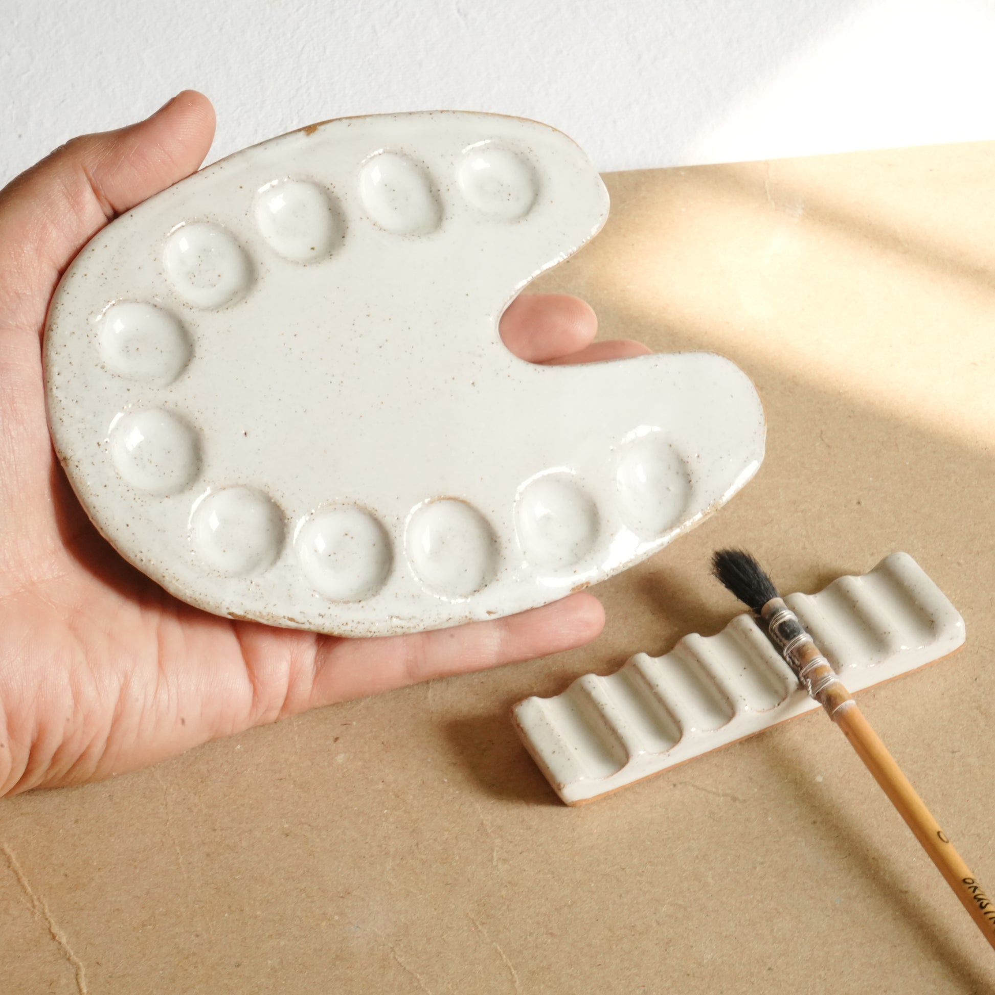 Each set is unique, made by hand in our studio. The clay is hand rolled and then each well is carved by hand. Then each palette is slowly dried and fired twice. As a result of this handmade process each item may have small variations in shape and size and will have its own speckle pattern.